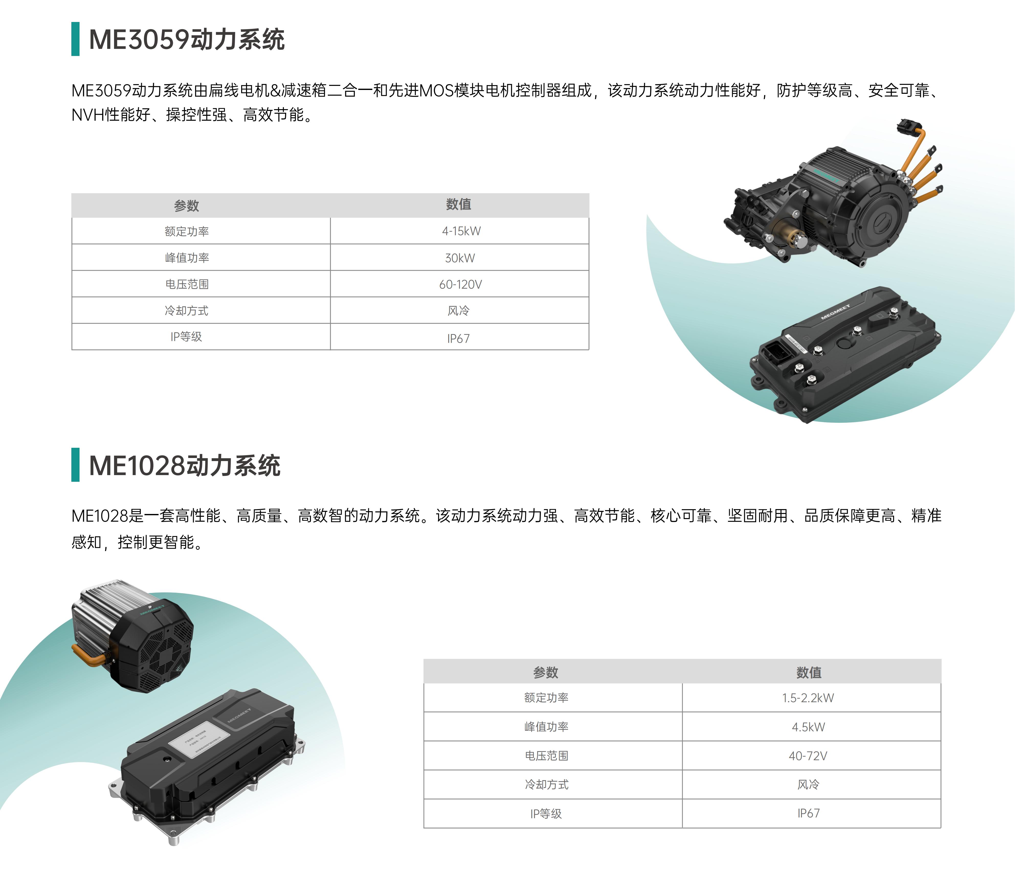 動力產(chǎn)品包括電機(jī)控制器、電機(jī)、二合一電機(jī)(電機(jī)+減速箱)、三合一動力系統(tǒng)(電機(jī)+減速箱+電控)等